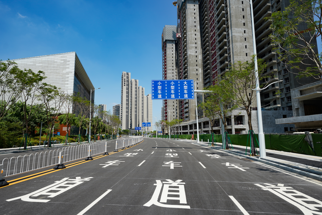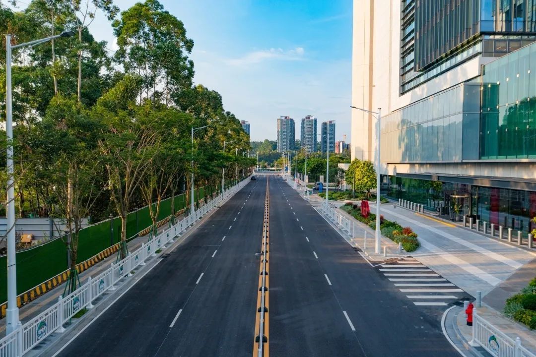 笔直清晰的标线、整齐排列的智慧路灯、新叶舒展的树木……驱车至南沙区体育馆附近,一条崭新的道路映入眼帘。